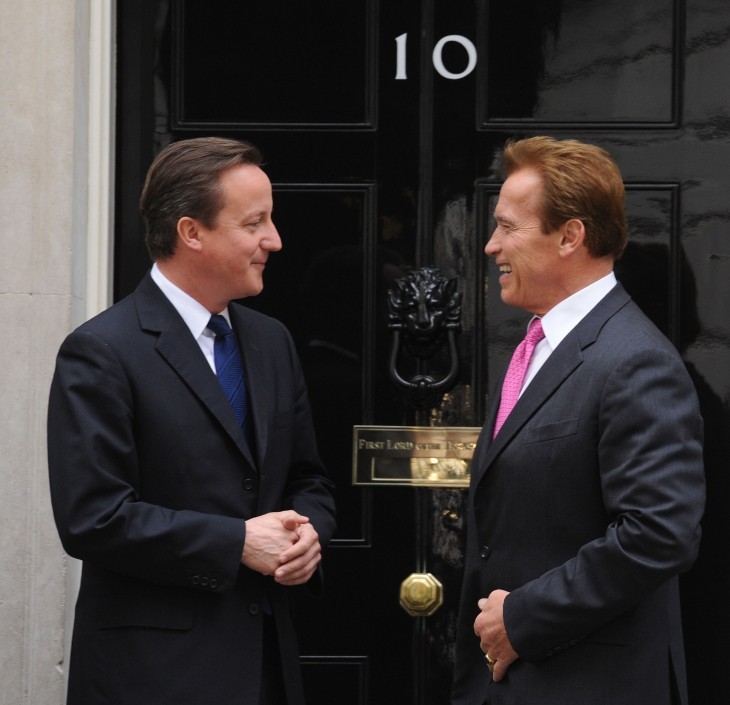 Arnold Schwarzenegger arrives at 10 Downing Street for a meeting with Prime Minister David Cameron.