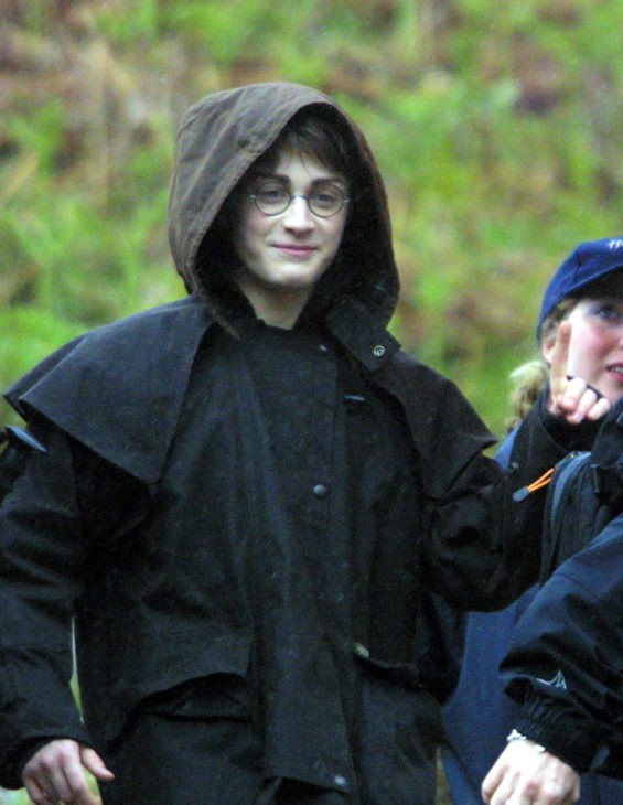 Actor Daniel Radcliffe smiles, just a bit, as he walks through the rain on the set of Harry Potter: The Prisoner of Azkaban. This took place somewhere in Scotland in May of 2003. Daniel Radcliffe was born in July of 1989, so he was a tyke of 13 when this photo was taken.