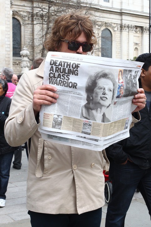 Demonstrators at Pageantmaster court, on the day of the funeral of Margaret Thatcher
