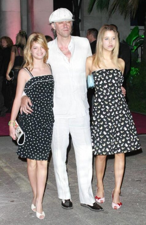 Sir Bob Geldof (left) pauses for a photo with daughters Fifi Trixibelle (center) and Peaches at a Brit Award after-party in 2005. This was at the Bluebird restaurant on Kings Road in London, England on February 10, 2005. Fifi (born 1983) and Peaches (b. 1989) were both the daughters of Paula Yates and Bob Geldof. Yates and Geldof were divorced in 1996, and Yates died of a drug overdose in 2000.
