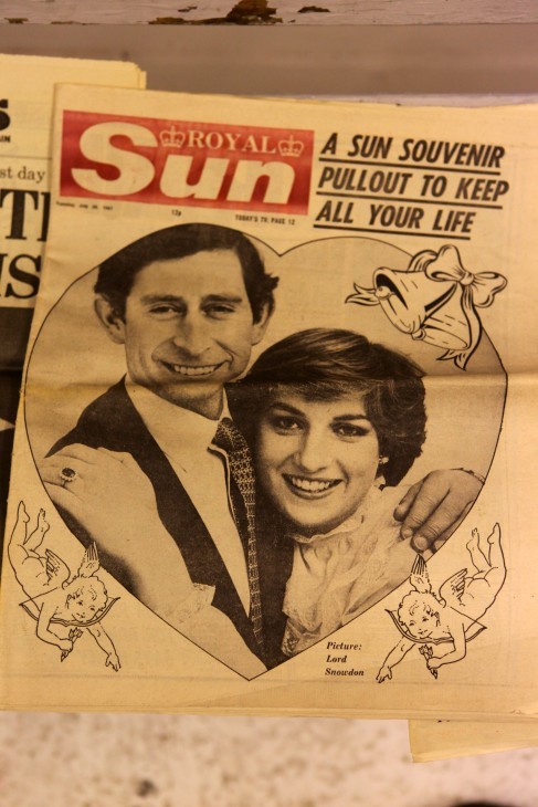 Royal Wedding memorabilia: the front page of the Daily Express after the wedding of Prince Charles and Lady Diana, presented during an exhibition in Shoreditch. This was in London, England on April 26, 2011. (The wedding itself was on July 29, 1981.)