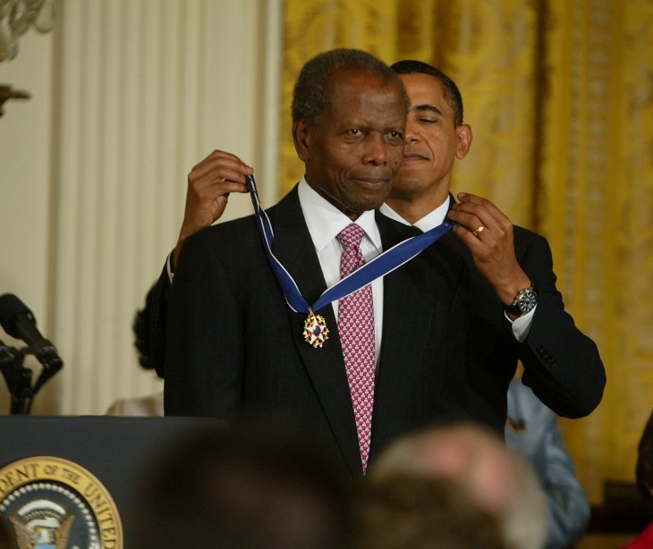Sidney Poitier recipient of an Honorary Award by the Board of Governors of the Academy of Motion Picture Arts and Sciences and Walter Mirisch former President of the Academy President pose for photos backstage at the 74th Annual Academy Awards