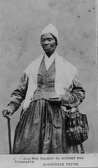 A card featuring a photo of Sojourner Truth wearing spectacles, shawl, and peaked cap, circa 1864. The caption reads, "I sell the shadow to support the substance. Sojourner Truth."